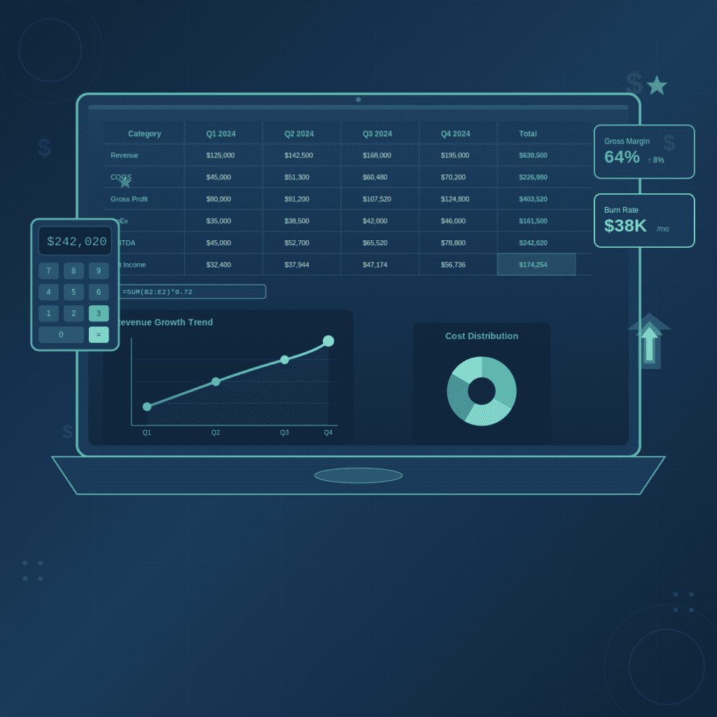Scenario-based Excel models that survive due diligence. Revenue projections, unit economics, burn rate analysis, and sensitivity testing—all built on assumptions you can defend.