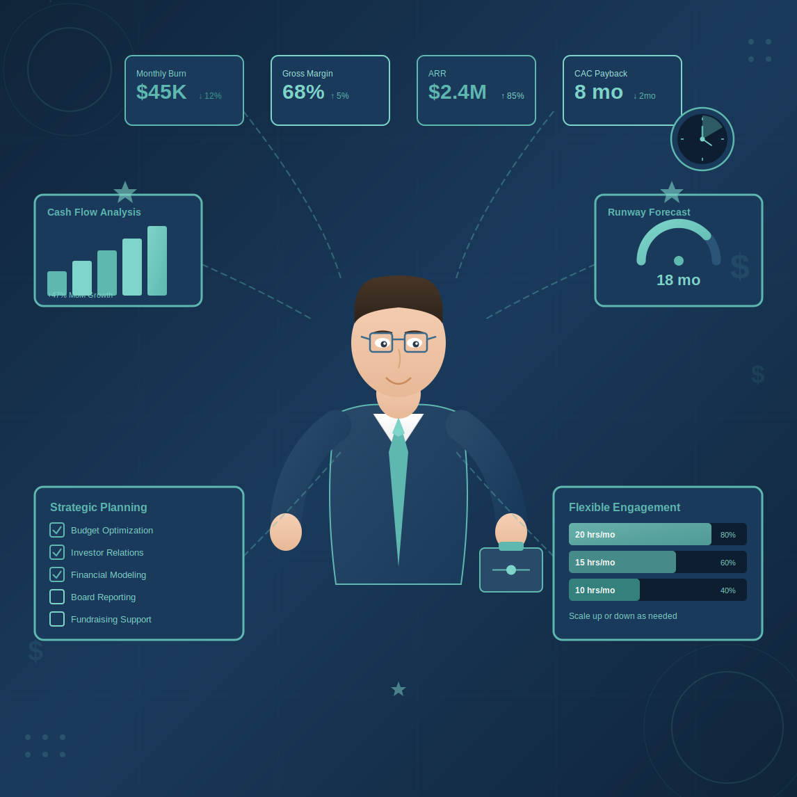 Ongoing financial leadership without the full-time cost. Cap table management, investor relations, strategic finance support and regular accounting and bookkeeping function.